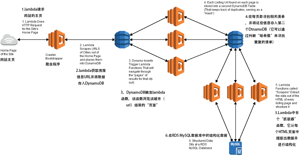 每页的HTTP请求需要0.7~1.1秒,每个lambda函数转换时间加上MySQL存储时间,大约需要两秒。每个Lambda函数收到Dynamo的数据去处理大约需要7秒。