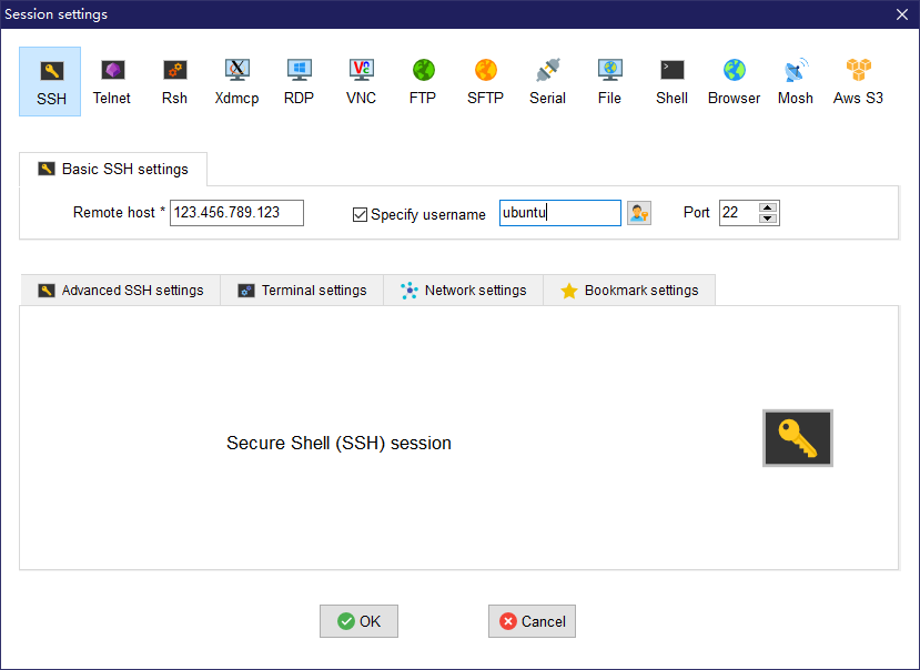 我这里以MobaXterm的终端软件为例,点击左上角的Session按钮,选择以SSH方式连接,在Remote host输入你的服务器的公网IP地址,Specify username输入你的用户名,如果你的服务器是Ubuntu系统,请输入ubuntu如果是CentOS系统则输入root。这里我们是CentOS系统,所以我们输入root。