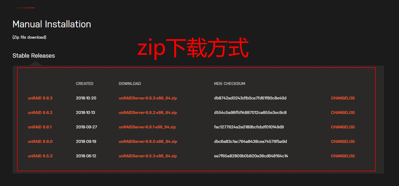 下载unRaid非常简单,我们只需要访问其官网,然后点击右上角的Download按钮跳转到下载页面。这里官方提供了两种下载安装方式,第一种是官方推荐的安装方式,只需要下载官方安装包,双击安装即可。第二种是下载zip文件,然后将其解压到你的U盘。