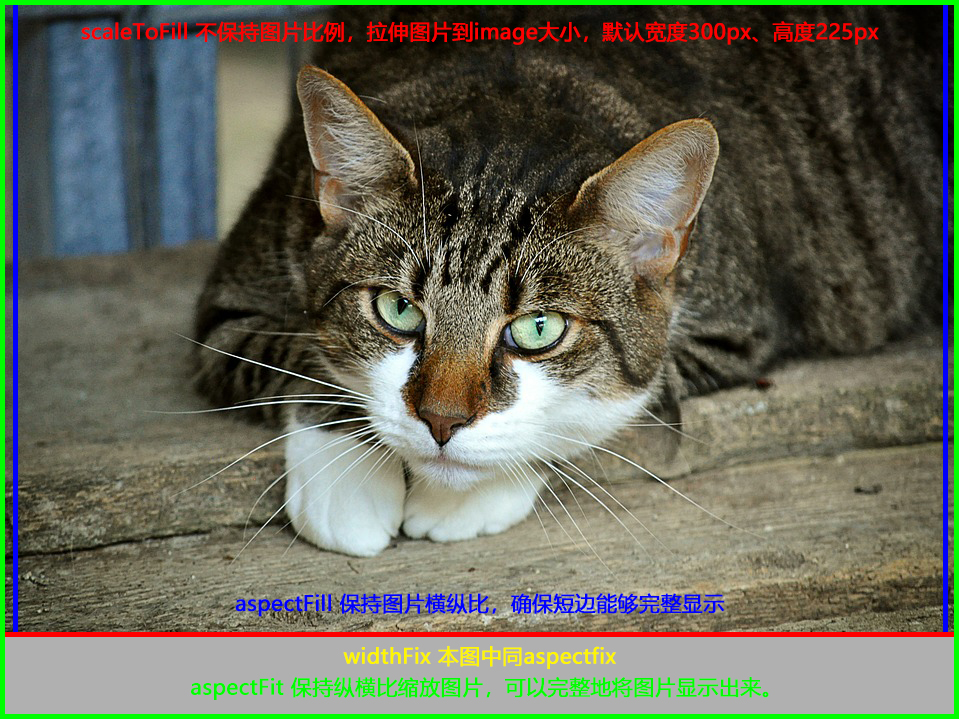 | 缩放 | scaleToFill | 不保持纵横比缩放图片,使图片的宽高完全拉伸至填满 image 元素 |