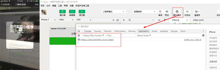 这时,我们点击微信开发者工具的真机调试按钮,然后使用手机扫码二维码,如果你扫码二维码,控制台返回了二维码相关结果,证明配置成功。